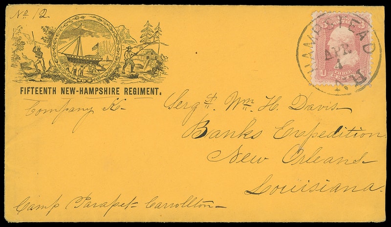 Fifteenth New-Hampshire Regiment., regimental patriotic design showing State Seal and wilderness scene with ms. "Company K" beneath, on orange cover bearing 3¢ rose (65) tied by "Hamstead N.H. Apr 1" cds addressed to Sergt. Wm. H. Davis, Bank Expedition, New Orleans La., endorsed "Camp Parapet Carrollton" at lower left; reduced slightly at right, Very Fine and attractive use to occupied New Orleans.