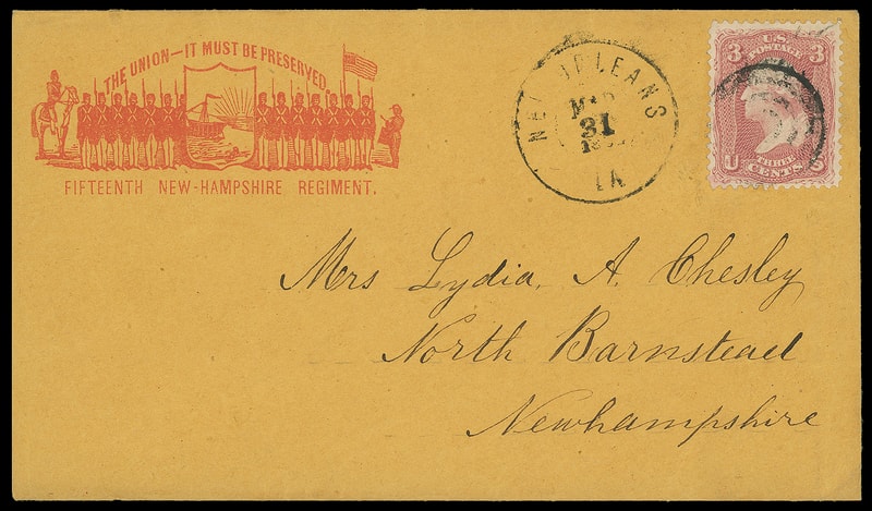 Fifteenth New-Hampshire Regiment., red regimental "The Union - It Must be Preserved" patriotic design on orange cover bearing 3¢ rose (65) tied by four-ring cancel duplexed with "New Orleans, La., Mar 31, 1863" cds to North Barnstead N.H.; barely reduced at left, Very Fine New Orleans Occupation use.