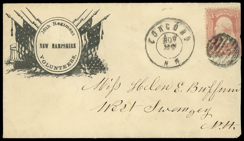 16th Regiment, New Hampshire Volunteers, regimental draped flag patriotic design on cover bearing 3¢ rose (65) tied by circular grid cancel, matching "Concord N.H. Nov 20" cds to West Swanzey N.H.; reduced at right trimming 3¢, Fine.