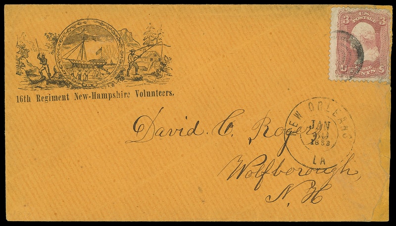 Sixteenth Regiment New-Hampshire Volunteers, regimental patriotic design showing state seal on orange cover bearing 3¢ rose (65), small tear, tied by "New Orleans La., Jan 2, 1863" cds to East Washington N.H.; reduced slightly at right, edge tears, Fine.