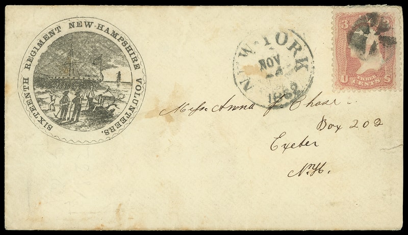Sixteenth Regiment New-Hampshire Volunteers, regimental patriotic design showing state seal on amber cover bearing 3¢ rose (65) canceled by cork duplexed with "New-York, Nov 23, 1862" cds to Exeter N.H.; reduced slightly at right with small edge tear, F.-V.F.