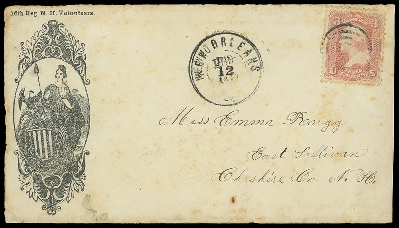 16th Reg. N.H. Volunteers, regimental patriotic design showing Lady Liberty, Eagle and Shield on cover bearing 3¢ rose (65), tied by partial four-ring target, matching "New Orleans La., Feb 12, 1863" cds to East Sullivan N.H.; cover front and back separated, minor tone spotting, F.-V.F.