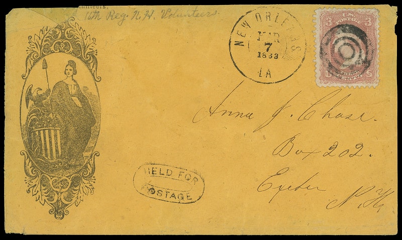 16th Reg. N.H. Volunteers, regimental patriotic design showing Lady Liberty, Eagle and Shield on cover bearing 3¢ rose (65), canceled by four-ring target duplexed with "New Orleans La., Mar 7, 1863" cds to Exeter N.H., neat New Orleans " Held for Postage " double-oval handstamp and additional "New Orleans La., Apr 18, 1863" cds backstamp; some paper torn away at top left and reverse, Fine.