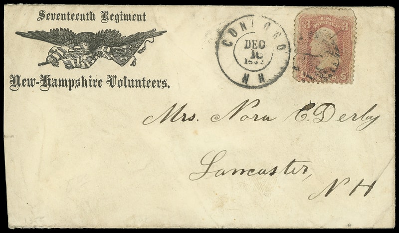 Seventeenth New-Hampshire Regiment., regimental Eagle and Flag patriotic cover bearing faulty 3¢ rose (65) canceled by circular grid cancel, matching "Concord N.H. Dec 16, 1862" cds to Lancaster N.H.; reduced at left with tiny edge tear, Fine, ex-Wolcott, Bischel .