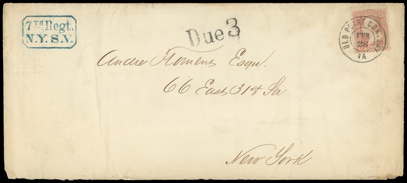 7th Regt. N.Y.S.V., blue framed corner card handstamp on legal-size cover bearing 3¢ rose (65) tied by neat "Old Point Comfort, Va. Feb 26" cds to New York City where "Due 3" handstamp struck; edge wear, F.-V.F.