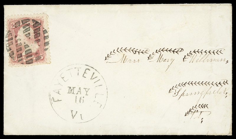 Circular Segmented Split Grid, bold strike ties 3¢ rose (65) , matching "Fayetteville Vt. May 16" cds with fancy addressing to Springfield Vt.; 3¢ short perfs at bottom, Extremely Fine gem use.