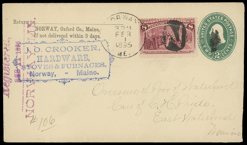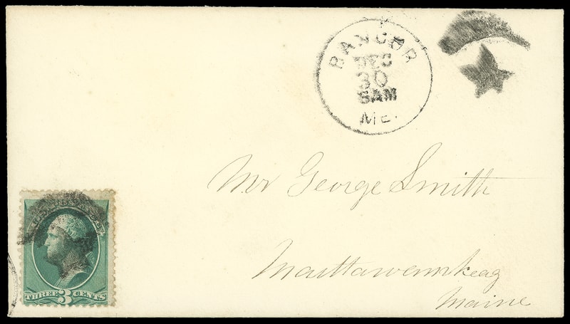 Maine Fancy Cancels, small group of 7 comprising Norway negative "N" on 8¢ Columbian cover, Bangor star & crescent on 3¢ #207, Foxcroft ME. circle of honeycomb wedges, Lewiston encircled stars on two #65, Showhegan star on #65, Thomaston pumkinface on #266, and Winterport seeing eye on #65; some faults, F.-V.F. group.