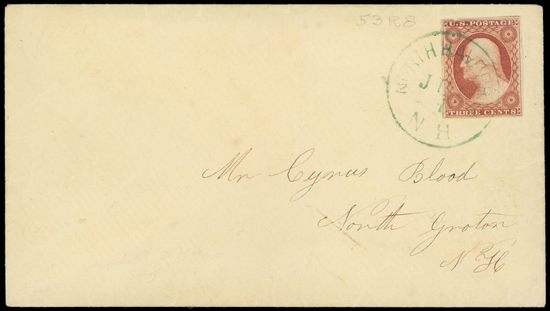 1852, 3¢ dull red, type I, position 53R8, four margins except nicked at top, tied by green "North Haverhill N.H., Jul 1" cds on light buff cover to North Groton N.H., Very Fine.