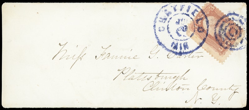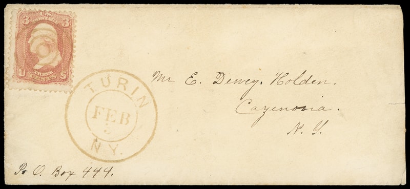 Olive "Turin N.Y. Feb 3", cds and matching target cancel ties 3¢ rose (65) on cover to Cazenovia N.Y., accompanied by violet blue "Chatfield Min, Jul 20" duplex ties 3¢ rose (65) , corner flaws, to Plattsburg N.Y., Very Fine and attractive pair of rare canceling inks.