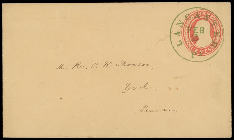 Lancaster Pa. Feb 2, perfect green cds cancels 3¢ red (U2) buff entire to York Pa., Extremely Fine and choice.