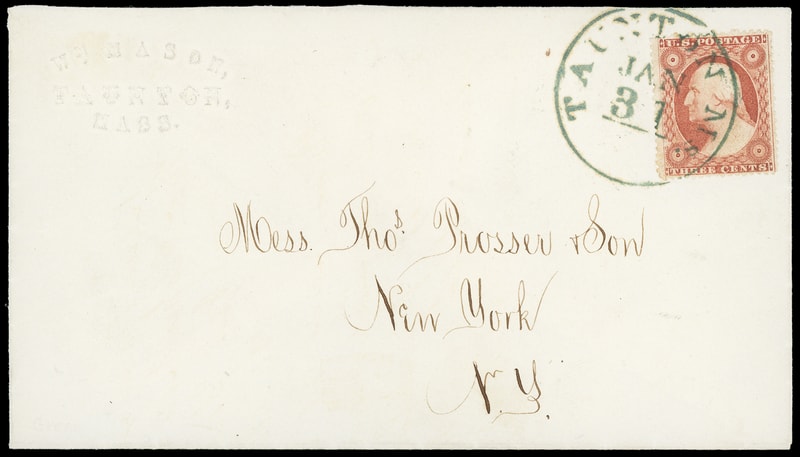 1857, 3¢ dull red, type III, well centered, tied by green "Taunton Ms., Jan 31" cds on clean cover with blind embossed "Wm. Mason, Taunton, Mass." corner card to New York N.Y., an Extremely Fine gem, ex-Moody .