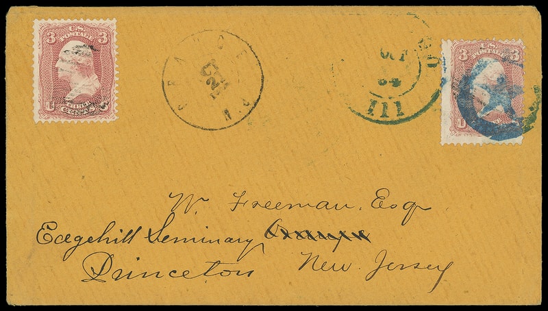 Blue Star within Circle, clear strike duplexed with partial "Chicago Ill. Oct '64" cds on orange cover to Orange N.j., forwarded with 3¢ rose (65) canceled by circular grid, matching "Orange N.H. Oct 21, 1864" cds to Edgehill Seminary, Princeton N.J., Very Fine, ex-Drews .