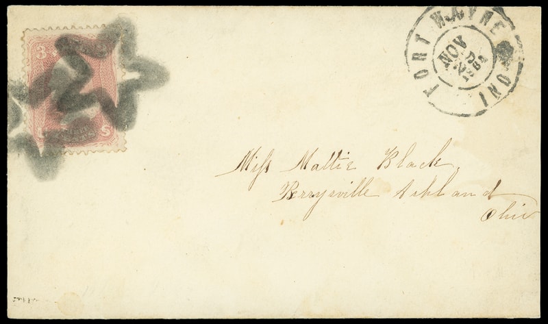 Open Star, bold double-strike ties 3¢ rose (65), matching "Fort Wayne Ind. Nov 29, 1864" cds on amber cover to Berrysville, Ohio, Very Fine and striking.