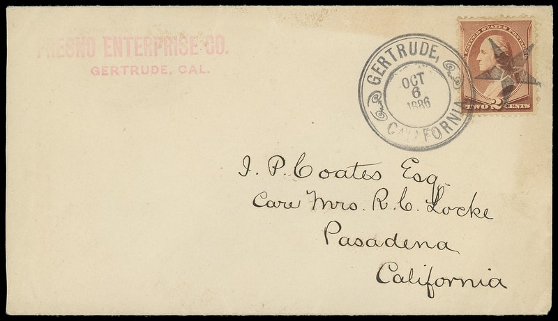 Double Star, sharp strike duplexed with fancy "Gertrude, California, Oct 6, 1886" dcds (FRE-2440) ties 2¢ red brown (210) on cover to Pasadena, Cal., Extremely Fine and remarkable strike, ex-Beane .