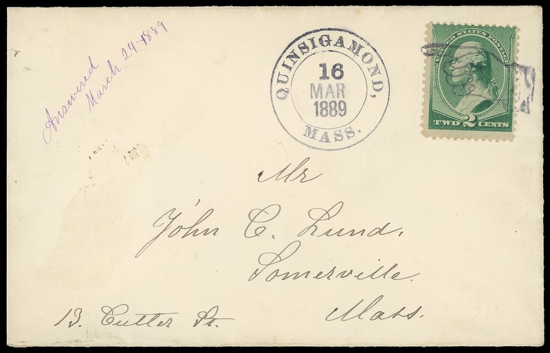 Pointing Hand, sharp strike duplexed with neat "Quinsigamond Mass. 16 Mar 1889" cds on cover to Somerville Mass.; barely reduced at left, Very Fine and choice.