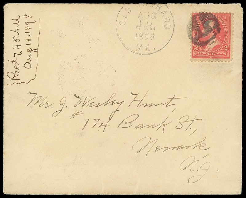 Negative Mask, clear strike duplexed with Old Orchard Me. Aug 16, 1898" cds ties 2¢ rose carmine (279Bc) on amber cover to Newark N.J., Very Fine.