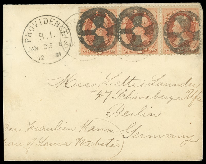 Wheel, bold strikes duplexed with "Providence R.I. Jan 25, 82" cds tie 2¢ vermilion (182) strip of three on cover to Berlin, Germany, Feb. 8th arrival backstamp; reduced slightly at left, otherwise Very Fine and striking Wesson time-on-the-bottom use.