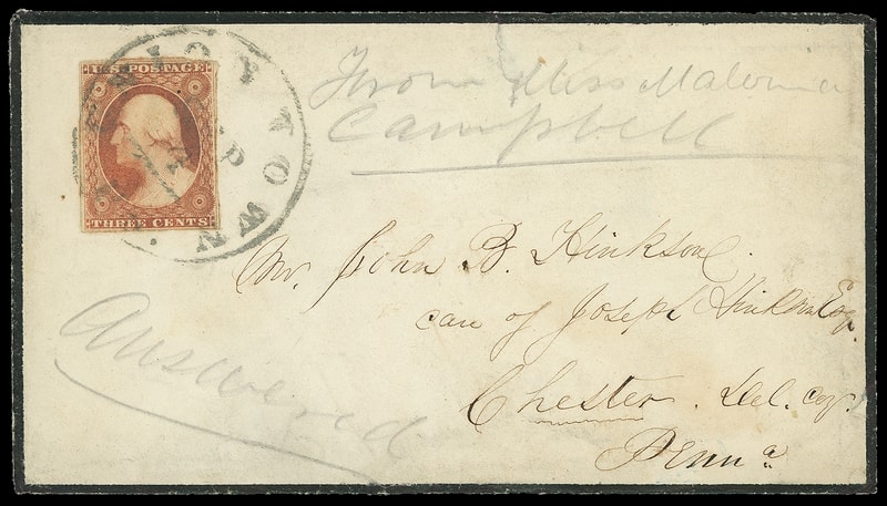 (Seven Years War) 1856 (Sep. 4) Unionville Pa. to Chester Pa., mourning cover bearing 3¢ dull red (11) tied by "Unionville Pa. Sep 4" cds with a detailed six-page letter recounts location of writer's house and farm relative to major battle and encampments of the Seven Years War, and gunpowder sample in folded buff paper (now attached) from British Major General Braddack's defeat by the French at the Monongahela River (Ohio) on July 9, 1755, Braddack had the gunpowder buried in a glass bottle when he retreated and the letter indicates this sample had been recovered by a "mountaineer who had been digging near Dunbar's camp and had found it", Col. Washington was a consultant during this campaign; cover tear, F.-V.F. and unusual.