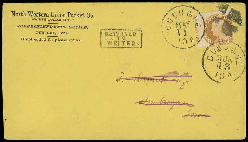 1869, 1¢ buff, tied by bold "Dubuque, Ioa. May 11" duplex cds strikes on yellow North Western Union Packet Co. "White Collar Line" corner card cover to local drop address, sharp " Returned to Writer " framed handstamp; small internal cover tear, otherwise Extremely Fine and choice.