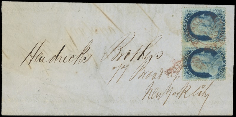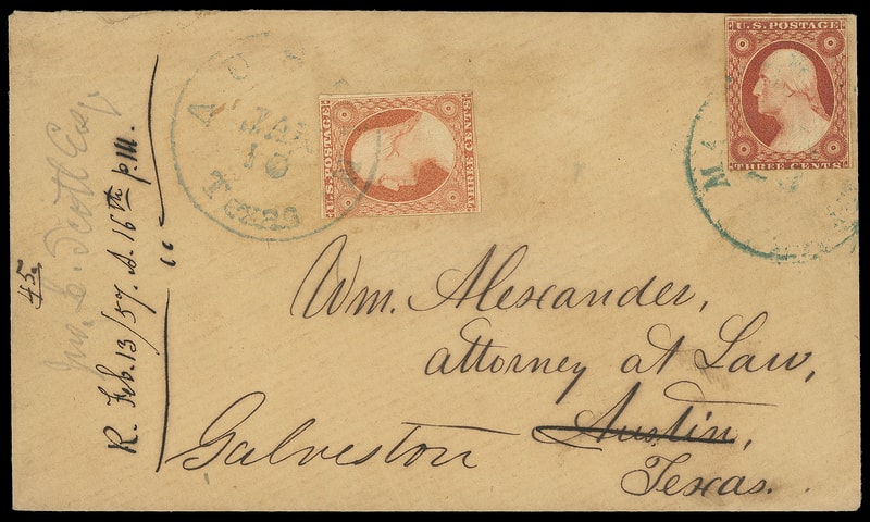 1852, 3¢ dull red, type II, three margins, tied by blue town cds on buff cover to Austin, Texas, forwarded with 3¢ dull red (11) tied by ultramarine "Austin, Texas, Jan 10" cds to Galveston, Texas, 1857 docketing at left; some edge wear, Very Fine Texas forwarded use.