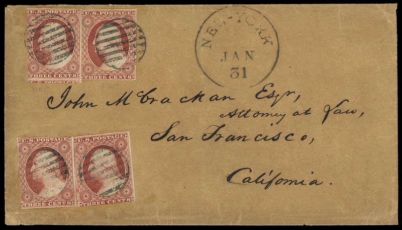 1852, 3¢ dull red, type II, four plate 1L singles, each canceled by circular grid, matching "New-York, Jan 31" Ocean Mail type 1 cds on buff cover to San Francisco Cal., Very Fine.