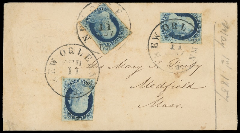 1852, 1¢ blue, type IV, three singles, margins to in, each tied by neat "New Orleans La., Feb 11, 1857" cds on light buff cover with embossed "St. Charles Hotel New Orleans" illustrated corner card to Medfield Mass.; minor lower left corner mend, otherwise Very Fine and whimsical arrangement of stamps.
