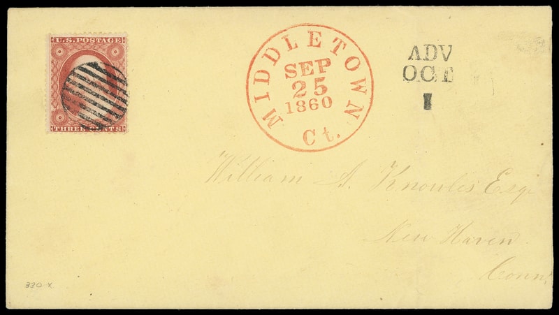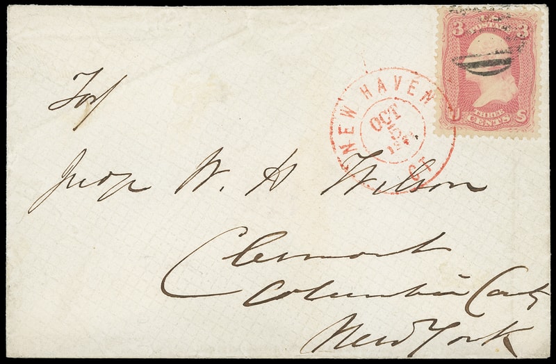 1861, 3¢ rose pink, beautiful radiant shade, tied by partial circular grid and red "New Haven Ct, Oct 5, 1861" cds to Nw York city; flap tear, fresh and Very Fine; with 1992 P.F. certificate.