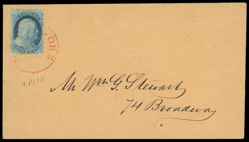 1851, 1¢ blue, type II, plate 1E, strong color, large margins except in at bottom, tied by partial red "New York" carrier cds on buff cover to local street address, fresh and Very Fine.