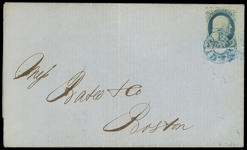 1852, 1¢ blue, type IV, position 40R1L, huge margins to slightly in, tied by blue "Balt. Paid" double-circle cancel on blue June 13, 1856 printed circular to Boston Mass., Very Fine use.