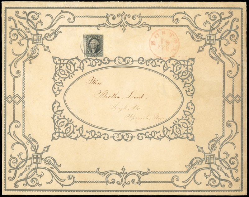 1851, 12¢ gray black, full to huge margins except touched at top right, tied by large "Paid" in Grid cancel, red "Boston, 19 Feb" cds on large 8x10½" silver lithographed envelope to Ipswich, Mass., original enclosed hand-painted valentine enclosure; lightly cleaned around stamp to remove gum toning, F.-V.F. and beautiful valentine use.