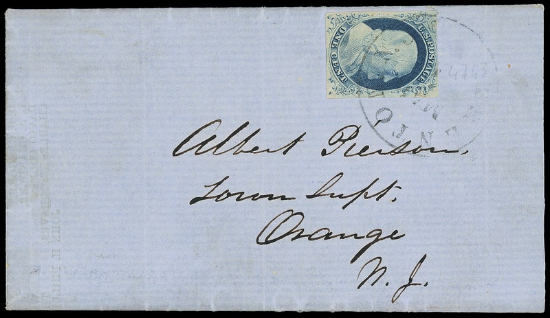 1852, 1¢ blue, type IV, four margins, tied by partial "Trenton N.J. Mar 7" cds on blue March 1, 1856 New Jersey State Normal School printed circular to Orange N.J., Very Fine.