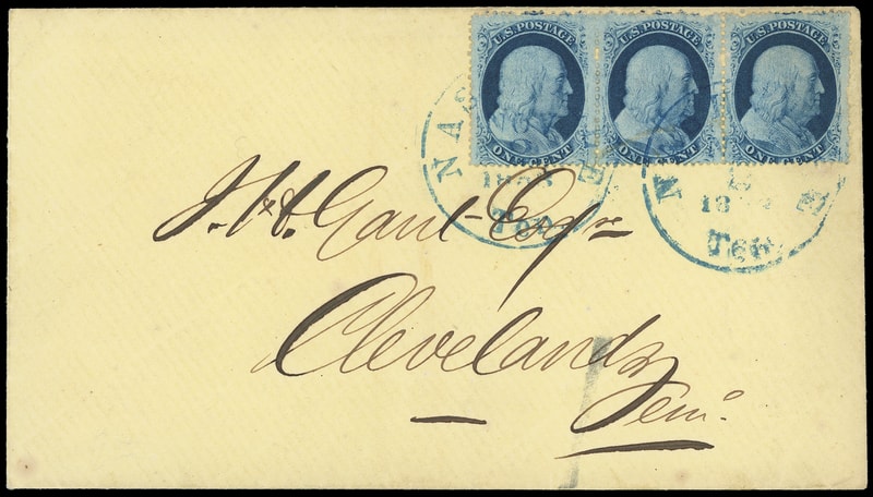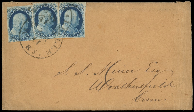 1852, 1¢ blue, type IV, three singles, pos. 25L1L, 26L1L, 28L1L, margins to slightly in, deep rich color, all tied by "Louisville Ky. Jan 11" cds on 1852 cover to Weathersfield, Conn., original enclosed letter datelined "Maysville Jan 10, 1852"; minor edge wrinkling and wear, F.-V.F. with unusually deep rich color for plate 1 early.