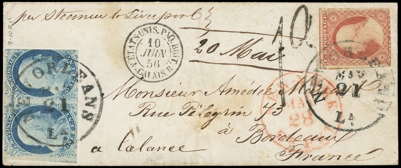 1852, 1¢ blue, type IV, pair, pos. 9-10R1L, margins to in at right, used with 3¢ dull red (11A), margins except in at bottom, each tied by "New Orleans La. May 21" cds on small 1856 cover to Bordeaux France , red "New York, May 28, Br. Pkt." exchange cds, London (6.9) transit backstamp, Calais (6.10.56) entry cds with matching " 19 " accountancy handstamp, reverse with Paris (6.11) transit and Bordeaux (6.12) arrival cds; light aging, F.-V.F.