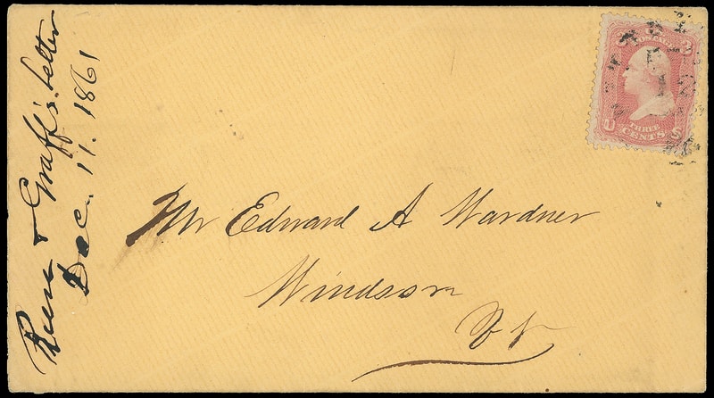 1861, 3¢ pink, lightly tied by partial Dec. 12 town cds on buff cover to Windsor Vt., 1861 docketing at left, F.-V.F.