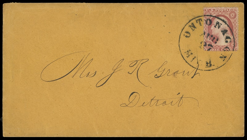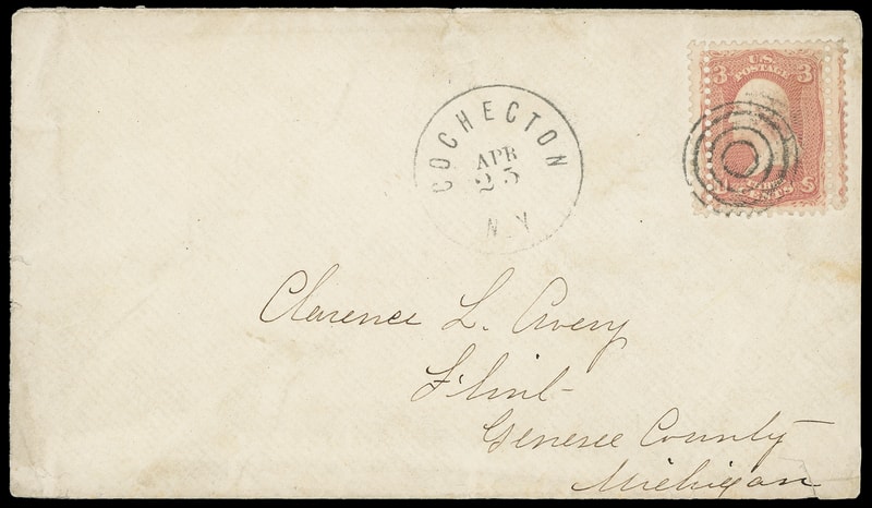 1861, 3¢ rose, double perfs , wide stamp, neatly tied by four-ring target cancel, matching "Cochecton N.Y. Apr 25" cds on cover to Flint, Michigan; couple small edge tears, Very Fine on-cover variety.