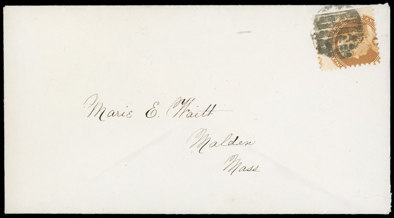 1869, 1¢ buff, dramatically miscut, rich color, tied by bold circular grid cancel on cover to Malden Mass., Very Fine and unusual.