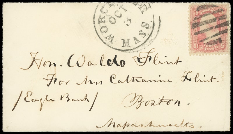 1861, 3¢ rose pink, nicely centered with rich color, corner flaws, canceled by sharp segmented circular grid cancel, matching "Worcester Mass. Oct 3" cds to Boston Mass., Very Fine and attractive use; with clear 2021 P.F. certificate.