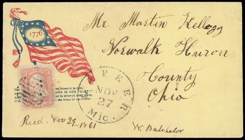 1861, 3¢ pink, beautiful shade on thin paper, s.e. at left, tear and crease, tied by circular grid, matching "Lapeer Mic. Nov 27" cds on "1776" Flag patriotic design on yellow cover to Norwalk, Ohio, Very Fine appearance.