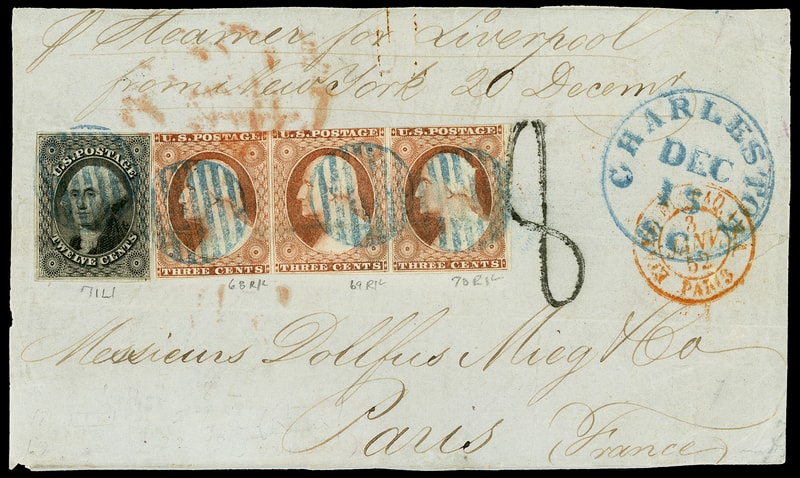 1851, 12¢ gray black, pos. 71L1, used with 3¢ brownish carmine (11A) strip of three , pos. 68-69-70R1L, margins to in, each canceled by matching blue circular grid cancels, matching "Charleston S.C. Dec 15" cds on 1852 blue cover front to Paris, France , carried by Collins Line Arctic from New York to Liverpool, red Paris (1.3.52) entry cds and bold "8" decimes due handstamp ties 3¢ strip, F.-V.F. and attractive use, ex-Hulme, Allen .