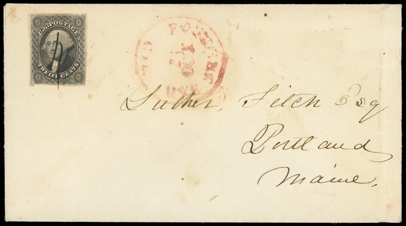 1851, 12¢ gray black, position 10R1, three margins, faults, tied by pen squiggle, red "Forster's Bar, Cal. Oct" cds to Portland Me., Fine and rare 12¢ used overland, only recorded 12¢ use from Forster's Bar, ex-Allen .