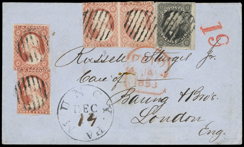 1852-57, 3¢ claret, type II, horizontal pair (pos. 92-93L1L showing double transfer in left stamp), used with two 3¢ brownish carmine (11A) plate 1L singles and 12¢ black (17) marginal single, pos. 80R1, each canceled by open circular grid, matching "Muncy Va. Dec 14" cds on 1853 blue cover to London, England , care of Baring Bros., New York red "19" credit handstamp, carried transatlantic by Cunard Line Niagara , red London Paid (1.14) tombstone handstamp; small stamp flaws, F.-V.F. and scarce use with two different 3¢ plate 1L shades.