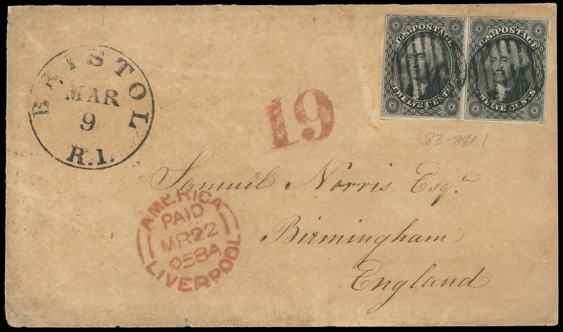 1851, 12¢ gray black, positions 83-84L1, large margins to touched at top, each canceled by neat circular grid, matching "Bristol R.I. Mar 9" cds on 1858 buff cover to Birmingham, England, "Boston, Br. Pkt. 10 Mar" exchange backstamp and red "19" credit handstamp, red "America, Liverpool, Paid, MR 22, 58" entry cds, Birmingham (3.23) arrival backstamp; flap tears and edge wear, F.-V.F.; with 1983 P.F. certificate.