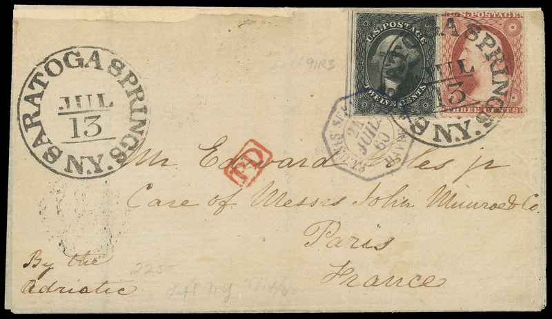 1859, 12¢ black, plate III, straddline line s.e., pos. 91R3, used with 3¢ dull red (26), tied by "Saratoga Springs N.Y. Jul 13" cds, additional strike at left on tissue paper cover to Paris, France, carried as endorsed by the Adriatic , ultramarine Havre (7.24.60) octagon entry datestamp also ties pair, small red "PD" framed handstamp, Paris (7.26) arrival backstamp; top left edge mend and flap missing, F.-V.F. appearance.