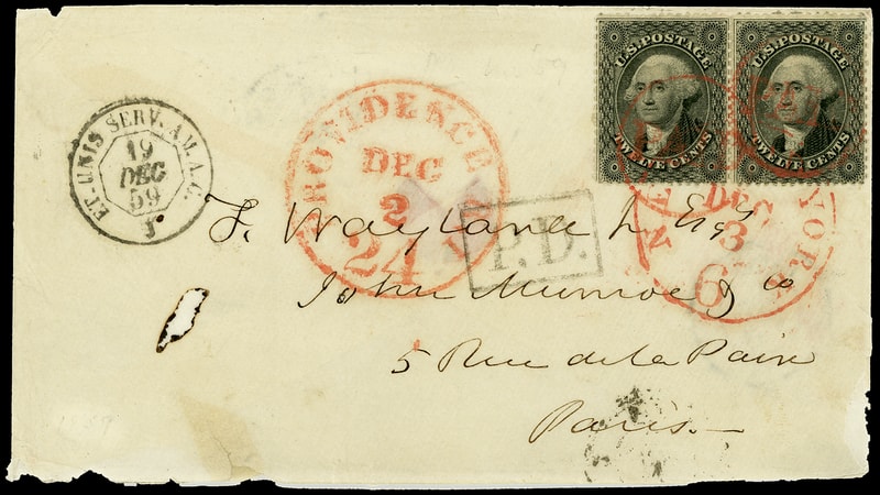1857, 12¢ black, plate I, horizontal pair, tied by red "Paid" in Circle cancels, matching "Providence '24' Dec 2" integral-rate cds on 1859 tissue paper cover to Paris, France, red "New York 'Paid 6' Dec 3" credit exchange cds also ties pair, carried transatlantic by Inman Line Vigo , Calais (12.19) entry cds and large "P.D." handstamp; cover faults, right stamp trivial corner crease, Fine appearance.