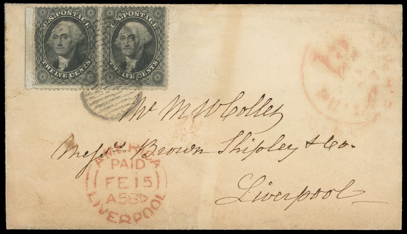 1857, 12¢ black, plate I, pair with left guideline selvage, pos. 21-22R1, tied by circular grid cancel, partial red "Philadelphia '19' Br. Pkt., Feb 2" credit exchange cds to Liverpool, England, carried transatlantic by Cunard Line Europa , red "Liverpool, America Paid, FE 15, 58" entry cds; reduced slightly at right, light toning, Fine.