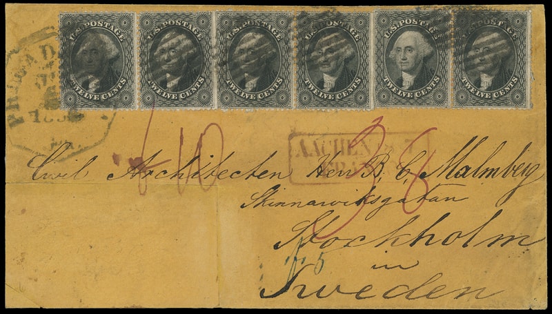 1857, 12¢ black, plate I, strip of four and pair, each canceled by circular grid cancel and tied by "Philadelphia Pa., Jul 6, 1856" octagonal datestamp on orange cover to Stockholm, Sweden , red "New-York, Br. Pkt. Jul 7" exchange backstamp and magenta ms. "38" credit rating, red "Aachen Franco, 18/7" framed transit; missing top flap, piece of cover cut out and reattached, otherwise Fine, otherwise Fine double-rate usage.