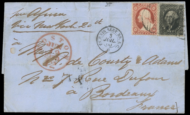1859, 12¢ black, plate III, used with 3¢ dull red (26) , tied by large "Paid" in Grid cancels, red "Boston 'Paid 12' Jun 19" credit exchange cds on 1860 blue folded letter to Bordeaux, France , carried transatlantic as endorsed by Cunard Line Africa , Calais (7.3) entry cds, Bordeaux (7.4) arrival backstamp; small edge tear, F.-V.F.