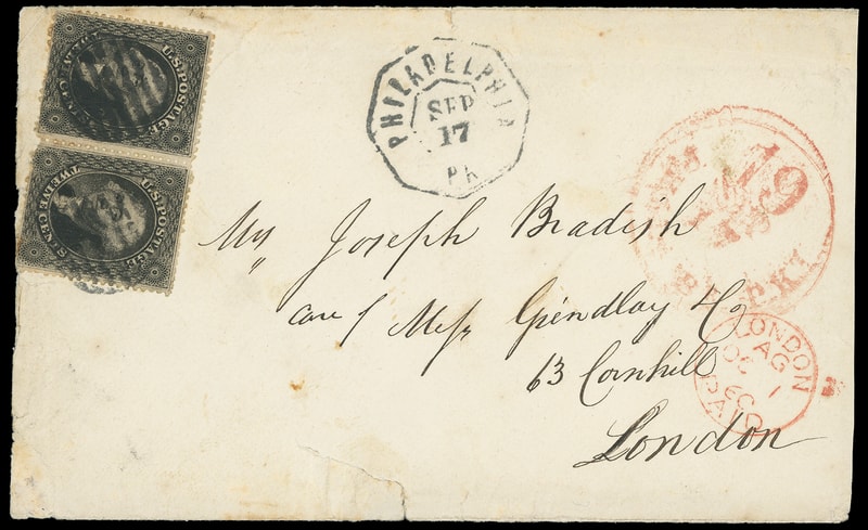 1859, 12¢ black, plate III, horizontal pair, tied by circular grids, matching "Philadelphia Pa., Sep 17" octagon datestamp on 1860 cover to London, England , red "Phila. Br. pkt. '19' Sep 17" credit exchange cds, carried by Cunard Line America from Boston Sep. 19th to Queenstown arriving Sep. 29th, red London Paid (10.1) arrival cds; cover edge tear and reduced at right, 12¢ flaws, Fine appearance.