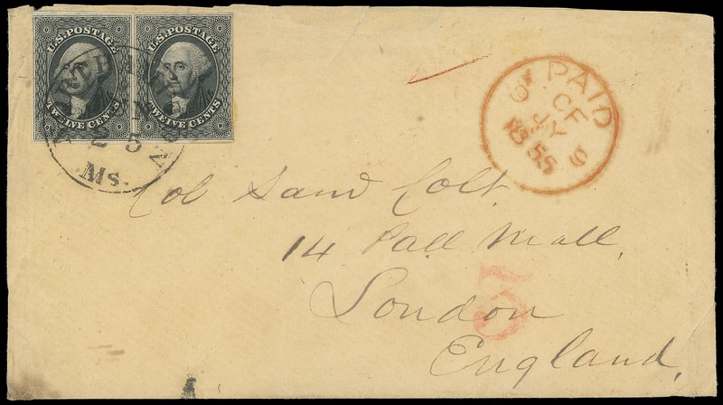 1851, 12¢ gray black, horizontal pair, pos. 95-96L1, large margins to barely touched at right, tied by "Northampton Ms. Jun 25" cds on buff cover to Col. Samuel Colt, London, England , New York red "3" credit handstamp, carried by Collins Line Baltic from New York Jun. 27th to Liverpool arriving Jul. 8th, red London Paid (7.9) arrival cds; partial flap and edge tear at top, F.-V.F.