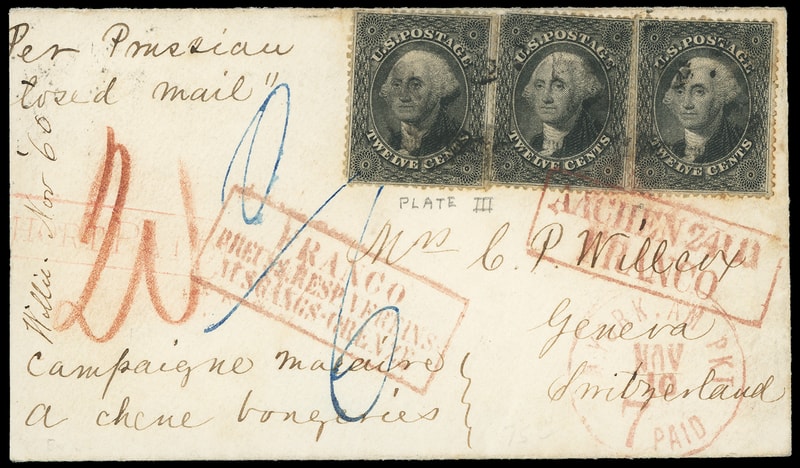 1859, 12¢ black, plate III, three singles, canceled by corks, red "N. York Am. Pkt. 'Paid 7' Nov 10" credit exchange cds on 1860 small cover to Geneva, Switzerland , sender's routing instructions "Per Prussian Closed Mail", red framed "Short Paid" handstamp, two stamps tied by red "Aachen Franco, 24/11" framed transit and matching " Franco/Preuss. Rep. Vereins/Auganga-Grenzes " (Paid to the Austrian-German Border), blue ms. debit rating, Geneva (11.27) arrival backstamp, Swiss red crayon " 20 " rappen due; reduced slightly at left, stamps with few short perfs and some slight toning, still Fine and unusual, still Very Fine and colorful short-paid use, ex-J. David Baker .